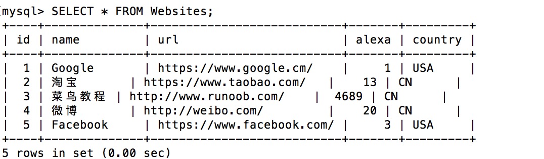 +----+--------------+---------------------------+-------+---------+| id | name | url | alexa | country |+----+--------------+---------------------------+-------+---------+| 1 | Google | https://www.google.cm/ | 1 | USA || 2 | 淘宝 | https://www.taobao.com/ | 13 | CN || 3 | 菜鸟教程 | http://www.runoob.com/ | 4689 | CN || 4 | 微博 | http://weibo.com/ | 20 | CN || 5 | Facebook | https://www.facebook.com/ | 3 | USA |+----+--------------+---------------------------+-------+---------+