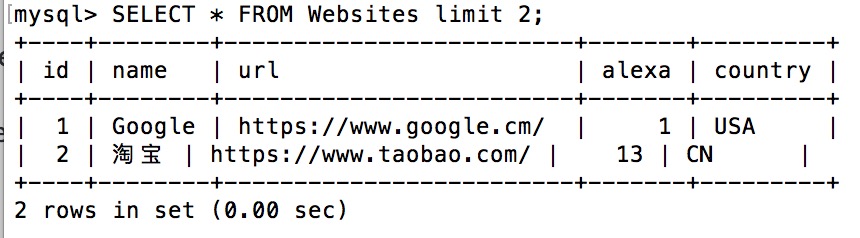 mysql> SELECT * FROM Websites;+----+---------------+---------------------------+-------+---------+| id | name | url | alexa | country |+----+---------------+---------------------------+-------+---------+| 1 | Google | https://www.google.cm/ | 1 | USA || 2 | 淘宝 | https://www.taobao.com/ | 13 | CN || 3 | 菜鸟教程 | http://www.runoob.com/ | 5000 | USA || 4 | 微博 | http://weibo.com/ | 20 | CN || 5 | Facebook | https://www.facebook.com/ | 3 | USA || 7 | stackoverflow | http://stackoverflow.com/ | 0 | IND |+----+---------------+---------------------------+-------+---------+